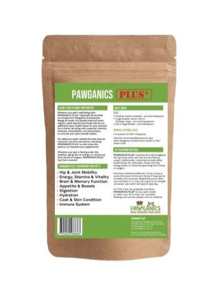 PAWGANICS PLUS+ is specially formulated to complement Pawganic Evolutionary Range of meals. This potent blend of plant-based superfoods is a great way to supplement your pet’s diet with additional vitamins and minerals. Made in Australia from organic, natural ingredients, PAWGANICS PLUS+ is free from chemicals, preservatives, and harmful additives. It contains essential vitamins, minerals, and antioxidants to support your pet's health.